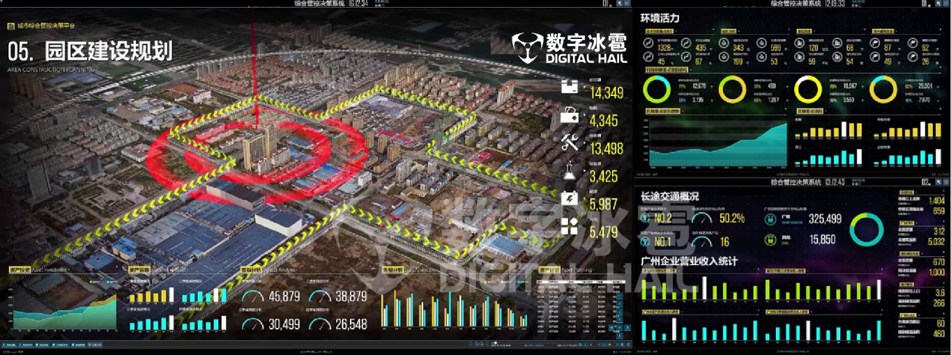 数字冰雹智慧园区智能运营中心(IOC)大屏可视化决策系统,面向各类园区运营管理部门的大屏可视化环境,具备优秀的大数据显示性能以及多机协同管理机制,支持大屏、多屏、超大分辨率等显示情景。