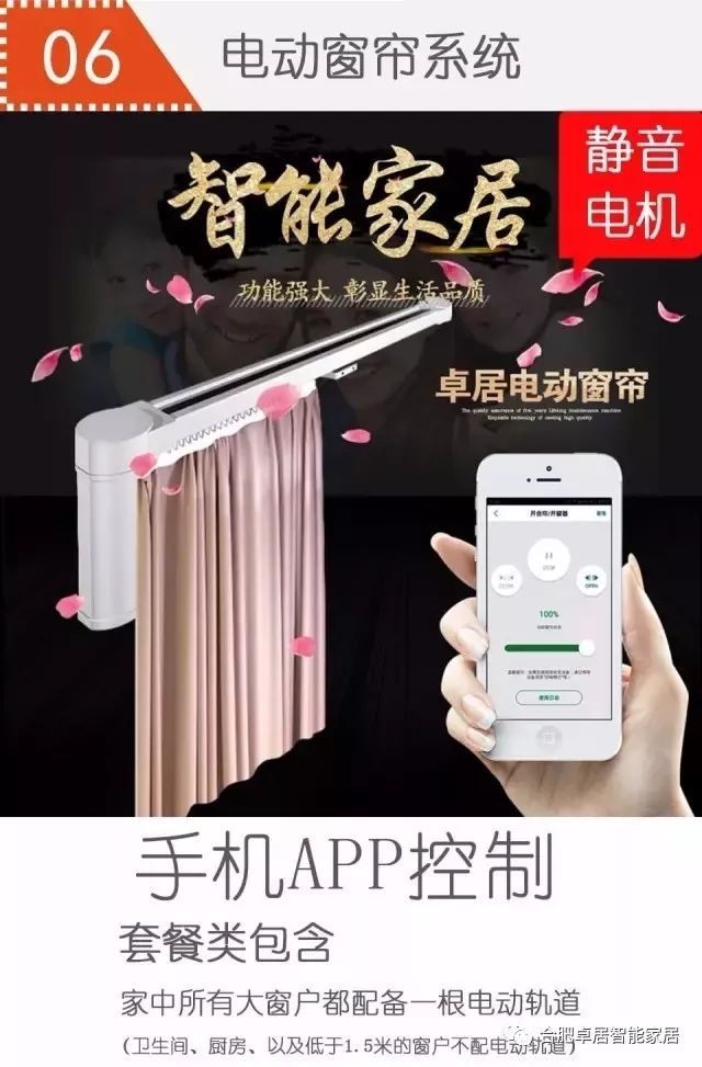 六、电动窗帘系统 电动窗帘系统采用的是卓居内置电机,可以通过手机APP控制窗帘,还可以通过手拉启动,若停电也可以手拉打开,窗帘轨道非常静音。套餐内的窗帘为单轨,可安装于客厅、餐厅、卧室、书房中。